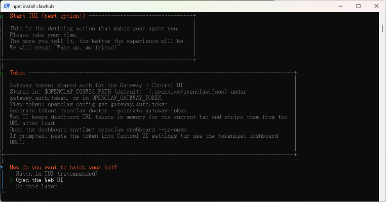 启动成功后,引导程序会问你是在终端界面(TUI)还是网页浏览器中使用 OpenClaw。