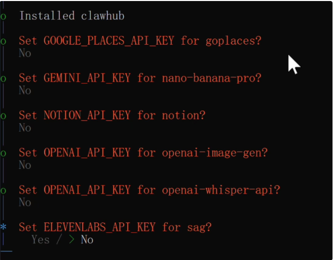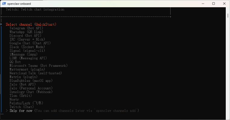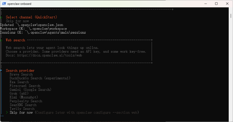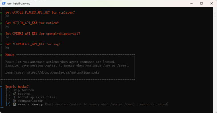 如果你是新手,保持当前选择 Skip for now 即可,先熟悉基础操作。等你需要自动化记录日志、自动备份记忆等高级功能时,再通过命令行启用: