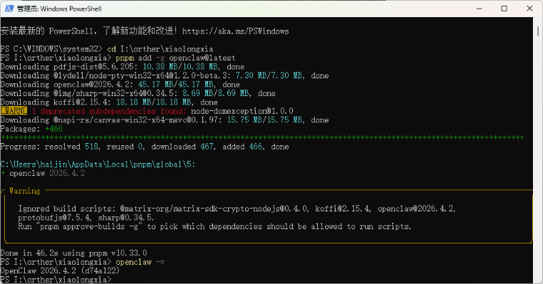 在新的 PowerShell 窗口中,用 pnpm 来安装 OpenClaw: