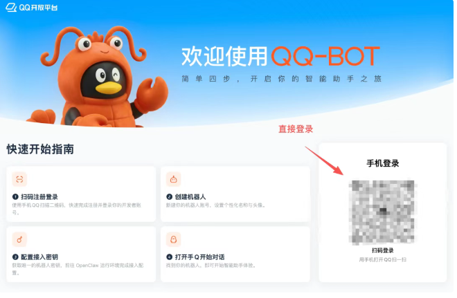打开 QQ 机器人 OpenClaw 接入页面,用 QQ 扫码登录: