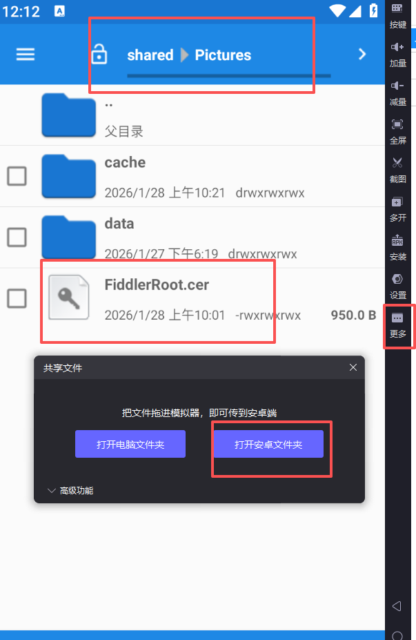 13、将步骤6导出的证书FiddlerRoot.cer文件导入至模拟器