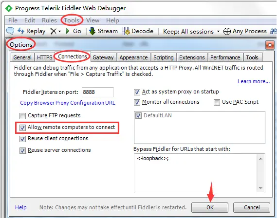 如果想要捕获手机上的通信数据,就需要手机连接上Fiddler代理,而Fiddler默认是不允许其他设备进行连接的,解决办法:点击 Fiddler->Tools -> Options,在 Connections 面板选中 Allow remote computers to connect 允许其他设备连接(此操作需重启Fiddler生效)。