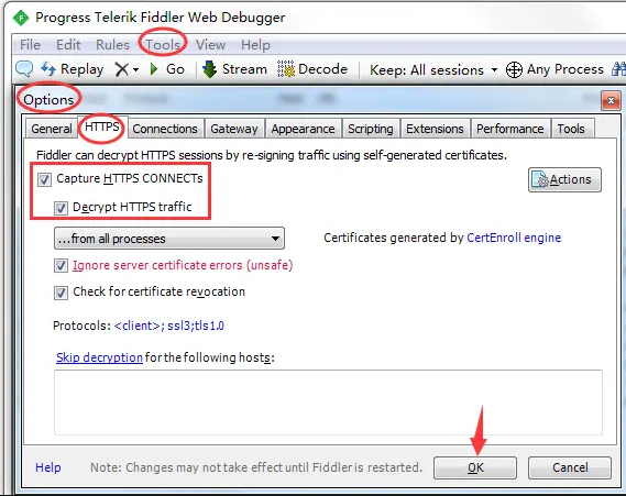 5、点击HTTPS,勾选Decrypt HTTPS traffic和Ignore server certificate(unsafe)