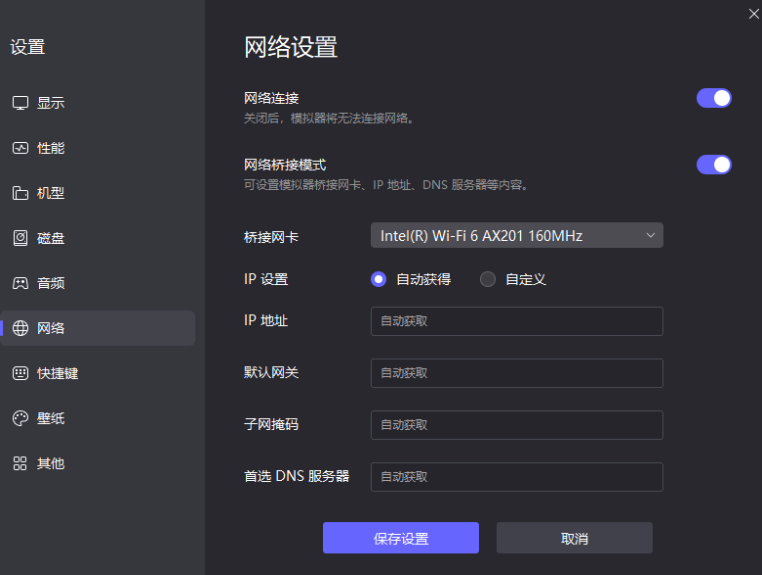 11、选择网络设置,勾选桥接模式,点击安装驱动,点击确定,点击保存设置